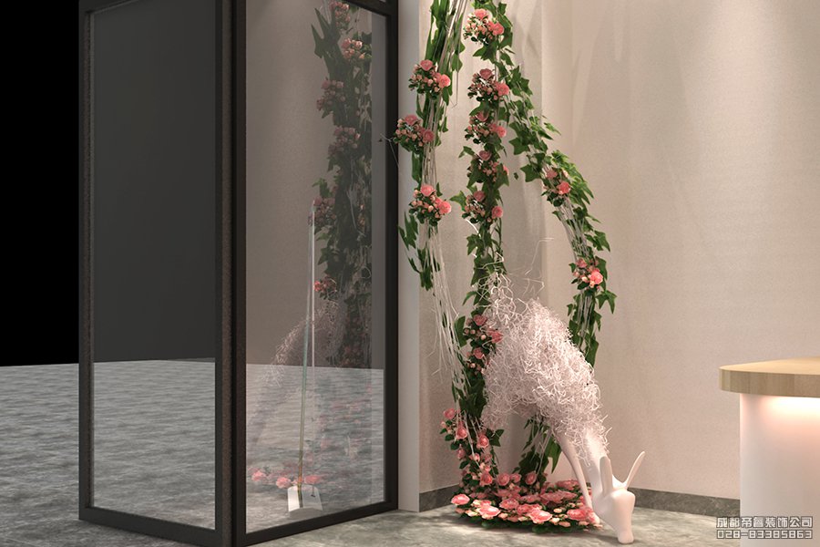 而在奶茶店休息區(qū)的另一角則是設計了一個獨立景觀空間,里面密密麻麻的裝飾著鮮艷花朵,再配以“白鹿”這種有著品牌意義的吉祥物,很好的詮釋了連鎖奶茶店鹿角戲這個品牌形象,同時也寓意著這是一家高端連鎖奶茶店。